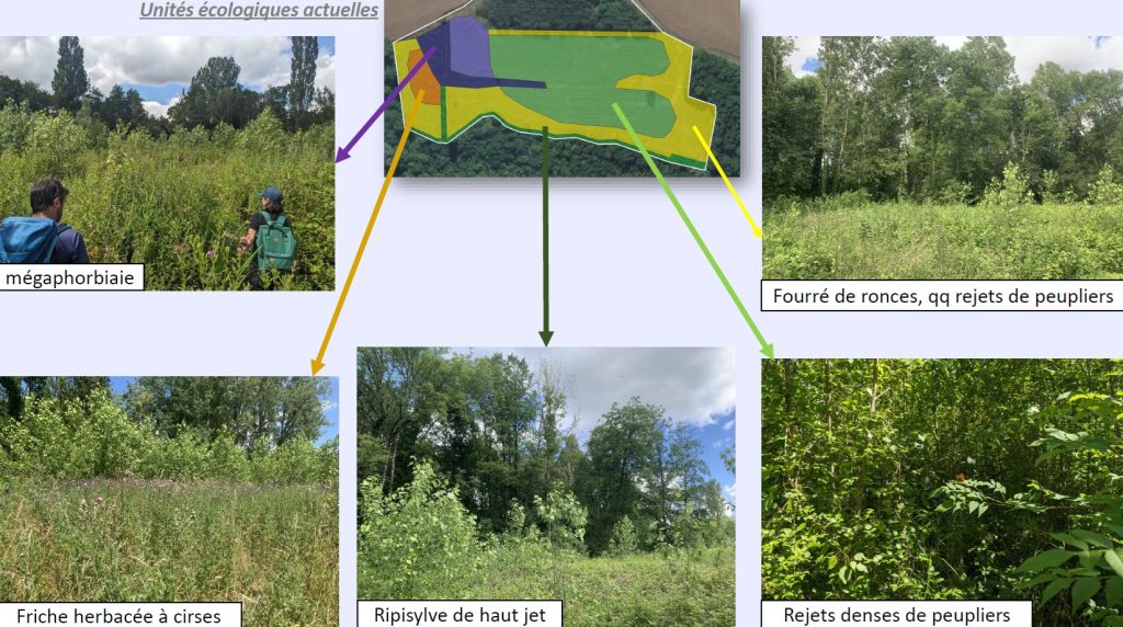 L’expertise du site fait ressortir 5 à 6 unités écologiques/habitats différents, parmi lesquelles 3600m² de surface caractérisée en « zone humide », un milieu ouvert à cirse commune (1000m²), un taillis dense de rejets de peupliers et fourré de ronces, avec des surfaces en phases de diversification (20 000m²), une mare temporaire… . Le sol argilo-limoneux est profond et relativement sain pour une certaine capacité épuratrice et une pédofaune importante.